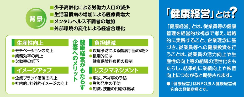 少子高齢化が進み、労働人口が減少することが予想される中、企業が従業員の健康増進に積極的に取り組むことで、生産性の向上やイメージアップにつなげる「健康経営」が注目を集めています。