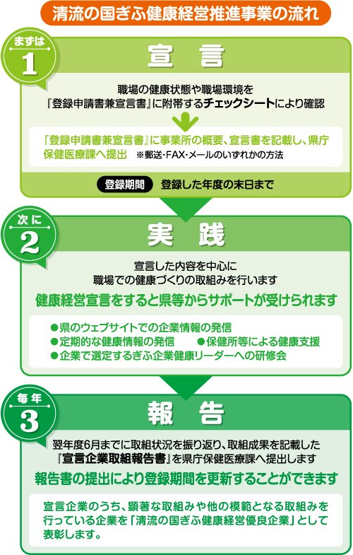 職場における健康づくりを支援する「健康経営推進事業」は、企業に従業員の健康づくりに取り組む表明として「健康経営宣言」を行っていただき、県は健康セミナーの開催や健康情報の提供などの支援を行うもので、419社に登録いただいています(6月18日現在)。