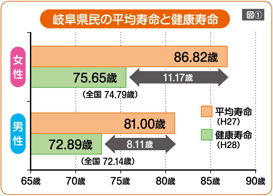 人生100年時代と言われていますが、県民が健康で自立して過ごせる期間(健康寿命)は、平均寿命より男性で8.11年、女性で11.17年短くなっています(図①)。この差を縮め、健康寿命を延伸させるため、県では、「第3次ヘルスプランぎふ21(平成30~令和5年度)」に基づき健康づくりを推進しています。
