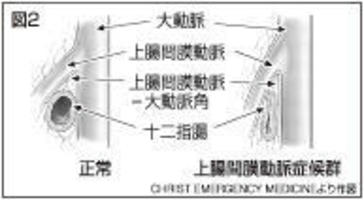 十二指腸は胃から続く消化管ですが、解剖学的には大動脈と上腸間膜動脈の間を通過して小腸である空腸に移行します=図1=。多くの人では、上腸間膜動脈と大動脈の間には十分な脂肪があり、上腸間膜動脈-大動脈の角度が十分に開いていて十二指腸が二つの動脈で圧迫されることはありません。しかし、やせた人では脂肪が少ないため、上腸間膜動脈-大動脈角が狭くなって十二指腸を圧迫し、通過障害を来す「上腸間膜動脈症候群」が発症します=図2=。