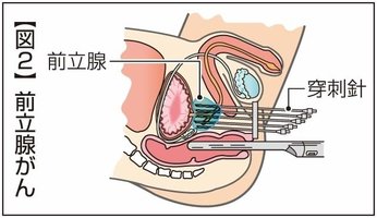 そして前立腺がん。こちらは高齢者に多く見られるようになりました。治療方法として手術、放射線治療、ホルモン療法があります。手術と放射線治療は治癒率も副作用もそれほど変わりはありません。手術に関してはロボット手術ができるようになったため、これまでより入院期間が短縮されています。放射線治療は主に二つの方法があります。外から照射する強度変調放射線治療という方法と、前立腺の内部に直接放射線を発する小さな金属(5ミリ×1ミリ)を穿刺(せんし)針を使って50個ほど埋め込む、低線量率密封小線源治療という方法です=図2=。後者の方法の利点は局所麻酔で3時間ほどで治療が終わり、数日後には退院できるということです。ただし進行がんには向いていない場合もあります。