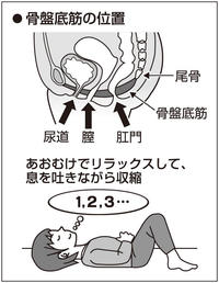 骨盤底筋は骨盤の底を覆っている筋肉の総称であり、骨盤内の臓器を支えるとともに尿道、膣、肛門を取り囲んで締める働きもしています。この筋肉を意識的に収縮させるトレーニングを行うことで、骨盤底のサポートを強化して症状の改善や悪化の予防ができることが分かっています。骨盤底筋は体の表面にある筋肉ではないので直接手で触れることはできません。息を吐いて体の中を陰圧、つまり体内の圧力を低くしながら、肛門をすぼめるようなイメージで骨盤底を体の中に引き上げるようにして締めます。5秒以上持続させる動きと、早く繰り返す動きを10回ずつ行います。姿勢は自由ですが、腹筋や臀(でん)部に力が入ってしまうと逆効果なので、最初はおなかやお尻に手を添えながら体の力を抜きやすいあおむけで行うと良いでしょう。骨盤底筋の場所を意識しやすいようにバランスボールなどに座って行うのも良い方法です。