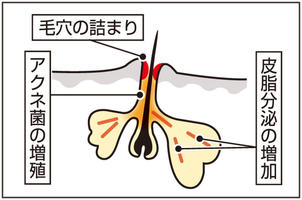 ニキビができる仕組みを簡単に説明します。大きく分けて三つの要因があります=図参照=。一つ目は、皮脂の分泌が増えることです。アンドロゲンと呼ばれるホルモンに皮脂の分泌を促す作用があり、思春期の頃にはこのホルモンの分泌が増えるため、若年層はニキビができやすくなります。二つ目は、毛穴が詰まることです。詰まった毛穴に皮脂がたまっている状態を面皰(めんぽう)(コメド)と呼びます。三つ目は、この面皰内に誰の皮膚にもいるアクネ菌が過剰に増殖して炎症を起こすことです。アクネ菌は皮脂と酸素が少ない状態を好むため、面皰の中はまさにうってつけの環境です。