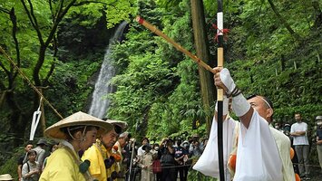 修験者が破魔矢を放ち「滝開き」 岐阜・養老の滝