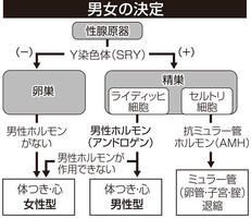 妊娠5~6週ごろになると、胎児のおなかの中に性腺原器ができてきます。特別な力が働かないと、性腺原器は自動的に卵巣になります。Y染色体に組み込まれているSRY遺伝子が性腺の芽(性腺原器)に作用すると精巣になります=図=。精巣のライディッヒ細胞からは男性ホルモン(アンドロゲン)が分泌され、妊娠9~20週にかけて精巣周囲の環境を整えながら、体外の陰嚢(いんのう)・陰茎(いんけい)を形成していきます。しかも、精巣のセルトリ細胞からは抗ミュラー管ホルモン(AMH)が分泌され、卵管・子宮・腟(ちつ)に成育する芽を縮小させます。