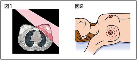 最近は乳房を温存した手術が多いですが、腫瘍が大きい場合は、乳房を全摘することもあります。また、手術の前に抗がん剤治療などをする場合があります。手術後は再発のリスクを下げるため、基本的にすべての患者さんで放射線治療を行います。図1の赤い部分は、放射線が照射されている範囲です(乳腺全体に照射)。放射線治療は、土、日曜日を除き、続けて25日間行います。腫瘍が大きい、ホルモン療法に適応がある場合は、放射線治療後にホルモン療法も追加します。