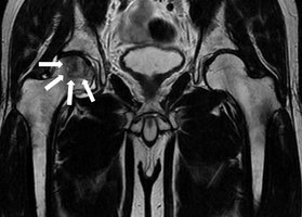 その次に画像検査をします。基本の画像検査はエックス線写真です。症状が進行しており大腿骨頭の陥没変形を認める場合はエックス線写真で容易に診断できます。しかし初期の段階で骨頭壊死の範囲が小さく、骨頭が変形していない場合はエックス線写真に異常が見られないことがあり、異常なしと判断されてしまうことがあります。早期診断を含めた最も有用な画像検査は磁気共鳴画像法(MRI)です。エックス線写真に異常を認めない段階でもMRIにより大腿骨頭壊死症を診断することが可能です。MRIにより大腿骨頭の陥没変形が生じる前から壊死が生じている範囲を詳細に把握することが可能です=写真=。