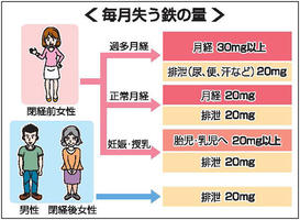 なぜ女性が貧血になりやすいのでしょうか。女性も男性も1日1ミリグラム未満の鉄を便、尿、汗によって排泄(はいせつ)して失います=図=。これに加えて、閉経前の女性は月に1回月経として出血します。健常な女性の月経は5日間前後で、約150ミリリットルの出血があります。1回の月経で15~20ミリグラムの鉄分を失うことになります。自分の月経の量が多いか少ないかは判断しにくいものですが、多い日にはナプキンを1~2時間以内に取り替えたり、レバーのような血の塊が出たりして、生活に支障がでる場合を「過多月経」といいます。子宮の体積が大きくなる子宮筋腫などがあると、月経の量が増えます(2015年1月19日付本欄参照)。ホルモンの分泌に異常があっても、キレの悪い月経が続き月経量が増えます。