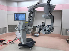 肉眼ではそのようなことは不可能です。「手術用顕微鏡」=写真=を使うのです。写真をご覧いただければ分かると思いますが、かなり大型の機器です。ですから、実際にはとても重いのですが、うまくバランスが取れた状態であれば、手術中の操作は極めて軽く、まるで宙に浮いているような感じです。