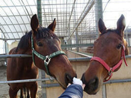 ラストランでも降っていた雪に興味を示すタッチデュール(左)。他の馬とも仲良しになった(ヴィゴラスステーブル提供)