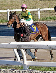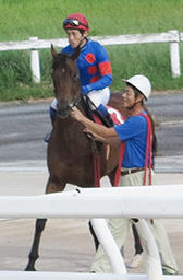 パドックを出て返し馬に向かうタッチデュールと大原浩司騎手。小さな体でよく頑張った