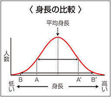次に、この"ばらつき"を示す指標である標準偏差(=σ、シグマ)の値(単位はセンチ)を求めます(具体的な算出方法は省略)。そして、平均身長から1σセンチ高い身長をA'、同じく1σセンチ低い身長をAとすると、「身長」がAからA'の範囲の子供は全体の68.26%となります。同様にB(平均身長-2σ)からB'(平均身長+2σ)の範囲は95.44%です。このσを用いて、例えば「平均身長から標準偏差の2倍以上低い者」を"大幅に"平均より背が低い子の目安にします。