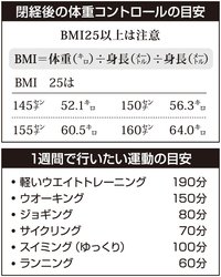 一つは体重コントロールです。肥満は指標となるBMIで判定され、BMI25以上の肥満は糖尿病や高血圧などの生活習慣病のリスクを高めるだけでなく、特に閉経後では乳がんの発症リスクも高めることが示されています。BMI25の身長別の体重を表(上)に示しましたので参考にしてください。