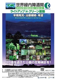 そして一度何ともなくても、大事なのは定期検診です。このポスター=写真=は、3月に実施される啓発活動期間「世界緑内障週間」のポスターで、今月くらいからいろいろなところで見掛けると思います。3月にはいろいろなところでライトアップ(ライトアップinグリーン運動)も企画しています。自分は大丈夫と過信するのはやめましょう。