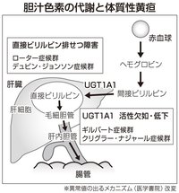 黄疸は、血液検査で肝機能検査の一つの総ビリルビン値が高値になって出現します。直接ビリルビンと間接ビリルビンの総和が総ビリルビン値です。総ビリルビン値の正常値は0・2~1・2ミリグラム/デシリットルで、2・5ミリグラム/デシリットル以上で黄疸が出現します=図=。