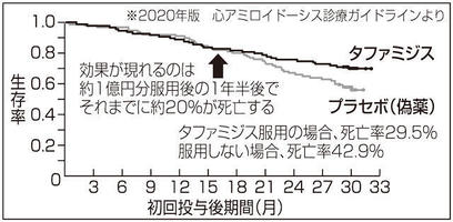 あの有名なきんさん・ぎんさんのぎんさんも、亡くなってからの検査で、他には何も病気は無かったのですが、ただ脳と心臓にこのアミロイドの沈着が認められたそうです。この病気による心不全は不治とされていましたが、近年、常識を超えるほど高価ではあるものの(薬価は1年間に約6400万円です)、新しい飲み薬タファミジス(商品名ビンダケル)が開発されました。ただし効果は一部の患者に限定的で、決してこの価格に見合う夢の薬ではないようです=図=。とはいえ、この薬を足掛かりに心筋症の治療法の開発がさらに進むことが期待されます。