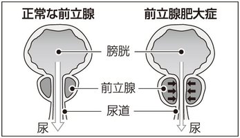 中高年男性に多く見られる尿の悩みの一つに前立腺肥大症があります。前立腺は男性にしかない臓器です。通常はクルミぐらいの大きさで、膀胱(ぼうこう)のすぐ下に尿道を取り巻くように存在しています。前立腺は精液の一部を産生する働きをしていますが、加齢に伴い徐々に腫大することで尿に関するさまざまな症状を引き起こすようになります。