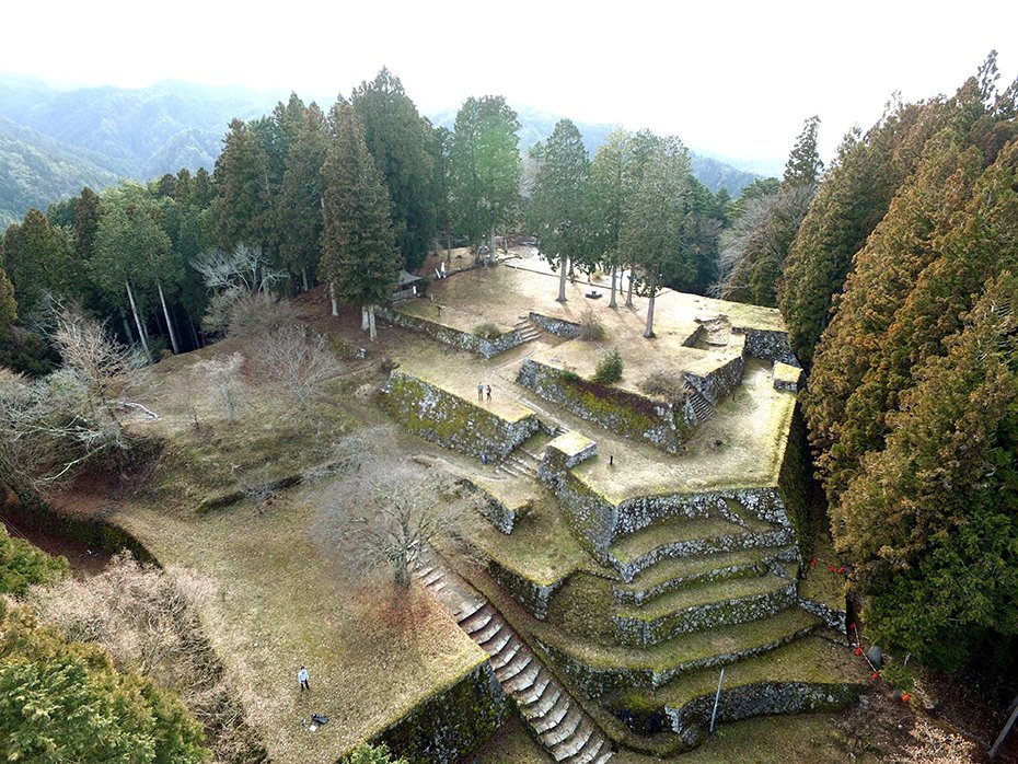 「日本三大山城」に数えられ、城郭ファンにも名高い岩村城(岐阜県恵那市岩村町)。階段状に積み上げられた山頂の石垣群は、その風格を漂わせている。