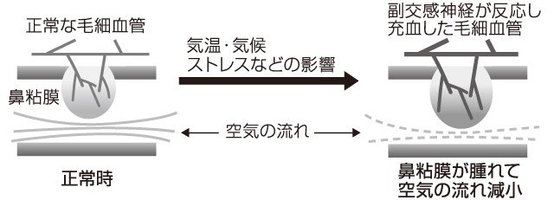 季節の変わり目には1日の気温差が大きくなります。この温度差が刺激となって自律神経が反応することにより、鼻の粘膜の血管が広がり、粘膜が腫れます。鼻炎症状は、そのことによって引き起こされる血管運動性鼻炎と考えられます。このような、温度差による鼻炎症状は温度差が7度以上になると出やすいといわれ、特にスギの花粉症で鼻の粘膜が過敏になっていると症状が出やすくなります。