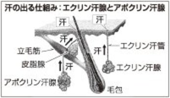 汗は皮膚の中の汗腺で作られて、汗管という管を通って皮膚の表面に出てきます。汗腺にはエクリン汗腺とアポクリン汗腺がありますが、主にエクリン汗腺が全身の汗を作ります。交感神経から汗を出す指令が出て汗が作られます。1日に700~900ミリリットルの水分を汗として出すことで体温を調節し、皮膚の表面をちょうどよい湿度に保ちます。また、不要になった塩分や乳酸、金属などを排出してくれる、人の体にとってなくてはならないものなのです。エクリン汗腺はひとりの人の皮膚に300万~400万個あるといわれています。全身のほとんどに分布していますが、最も多いのは手のひら、足の裏と脇です。