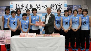 姉妹県の縁、女子バレー・ぎふリオレーナを応援 JA鹿児島きもつきが黒毛和牛と豚肉贈る