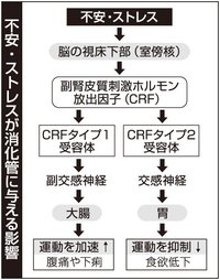 最近の急激な気温の変化は体力を消耗させ、自律神経系への大きな負荷となります。そのため少し外出するだけでも倦怠(けんたい)感、頭痛、腹痛、吐き気、目まいなどの症状が出ることがあります。この機序について説明すると=図=、不安やストレスがあると、脳の視床下部から副腎皮質刺激ホルモン放出因子(CRF)が放出されます。このCRFには2種類あり、CRFタイプ1は副交感神経に働き、大腸の運動を高めるため、腹痛や下痢になります。CRFタイプ2は交感神経に作用、胃の動きを抑制し、吐き気や食欲低下の症状が出てきます。