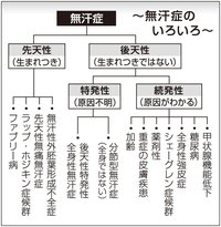 汗には体温調節という大切な役割があります。汗が全く出ない、あるいは極端に少ない人は、夏の暑い時期や運動した時に「うつ熱」の状態になり、発熱、全身のほてり感、脱力感、吐き気、目まい、頭痛、動悸(どうき)などの症状を起こします。ひどい時には熱中症になって意識を失うこともあります。