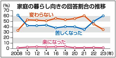 暮らし向き「苦しくなった」15年ぶりに6割超、岐阜県が県民調査 「収入増えない」53% 社会 政治・行政 2023年11月15日 20:32 岐阜県が今夏県民を対象に実施した... 残り520文字(全文:537文字) この記事をお読みいただくには「デジタルプラン」または「宅配+デジタルプラン」の会員登録が必要です。無料会員の方はログインしてマイページからコース変更してください。デジタルプランまたは宅配+デジタルプランをご登録中の方はログインしてください。 岐阜新聞デジタル会員に登録すると 無料会員向け記事が読める ニュースレターで最新情報が受け取れる デジタルプラン、宅配+デジタルプランなら Webオリジナルコンテンツが読める 紙面ビューアが読める チケットの先行発売に参加できる お得なクーポンが使える 新規登録ページ ログインページ トップ 岐阜のニュース 社会 暮らし向き「苦しくなった」15年ぶりに6割超、岐阜県が県民調査 「収入増えない」53% 関連記事 マウンドファイヤーや滝から飲み水「災害時、必要なものは周りに」アウトドア知識活用 岐阜・海津市 大豆ミート使ったハンバーグ、代替肉のヘルシー料理 岐阜・中津川、ちこり村で肉フェス 柿、ナシ、新米…60ブース出店、秋の味覚集結 岐阜・美濃加茂で市民まつり 市街や国道21号「オール岐阜」で渋滞緩和 時差出勤や在宅勤務、プロジェクト開始 七五三の参拝客でにぎわう 岐阜市の伊奈波神社 コロナ対策緩和で「今年は十数人連れも」 参政党岐阜県連、次期衆院選の公認候補が会見 岐阜3区と4区 おすすめ記事 飛騨の進学校は「真摯な挑戦」を積み重ねる 伝統+探究+DX&AIで時代を切り拓く!【ぎふ高校研究】 参政党岐阜県連、次期衆院選の公認候補が会見 岐阜3区と4区 3万個の光、冬の思い出に 可児市のアーラでイルミネーション 路線バス運転手、1日2時間勤務でもOK 岐阜バスが短時間契約の募集開始