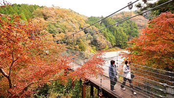 紅葉渓谷、つり橋囲む 岐阜・多良峡で見頃、児童植樹のモミジ4000本育つ