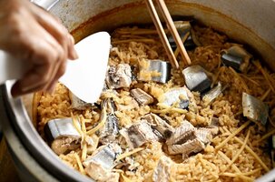 昔ながらの商家が残る旧中山道御嶽宿の一角。奥まった台所でガス釜のふたを開くと、湯気とともにサンマ独特の芳香が広がった。郷土料理「さより飯」が炊き上がった。