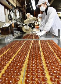 黄金色に輝くあめが次々と出来上が...