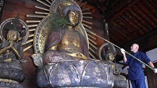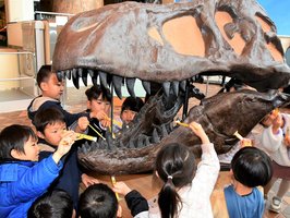 恐竜の歯ゴシゴシ、園児すす払い 岐阜県博物館、たつ年準備万端