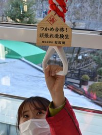 合格「がっちり」つかめ、受験応援へつり革登場 岐阜・金華山ロープウェー