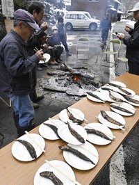 「おーい、よばれよか」。年配の人ばかり、十数人がたき火を囲み、イワシを頬張った。車の人が多く酒は飲まなくなったが、皆が集えば会話も弾む。雪景色の中、温かな時間が過ぎていった。