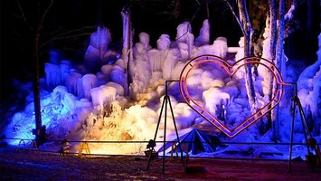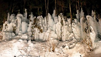 カラフル氷のオブジェ/山奥の氷の柱「青だる」再現 輝く銀世界、岐阜・高山市に自然の神秘