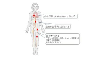 血栓症は、血液中にできた血液の固まった塊(血栓)が血管をふさいで生じる疾患です。静脈内にできた血栓が血管内に流され、肺や脳の血管を詰まらせると、生死に関わる重篤な症状を引き起こします。よく引き合いに出されるのが飛行機のエコノミークラス症候群です。長時間の座位、運動制限、水分摂取の減少などが影響し合い、血液が停滞し血栓が生じます。この血栓が流され肺に詰まったのが肺血栓症、つまりエコノミークラス症候群です=図=。肺の機能が著しく阻害されます。