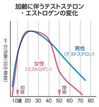 女性の更年期障害は女性ホルモンであるエストロゲンの低下が原因ですが、男性の場合は男性ホルモンであるテストステロンの低下が原因と考えられています。女性ではエストロゲンが急に減少する閉経時期の50歳前後に発症しやすいのに対し、男性のテストステロンは20歳前後をピークに以後緩やかに減少していくため発症時期は定まっていません。40代以降のどの時期でも起こり得ます。