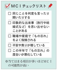 この認知症の早期診断・早期対応について活路を見いだしたのが「MCI(mild cognitive impairment、軽度認知障害)」という概念です。MCIとは、一言で言えば「認知症予備群」のことです。年のせいとは言い難い、アミロイドβのような“認知症の種(たね)”が原因による、心配な「もの忘れ」が現れ始めた状態がMCIです。表は、MCIに特徴的な症状のチェックリストです。