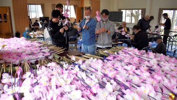 健康願い縁起物の花飾り準備 岐阜・関市、武芸八幡宮で14日に花馬まつり