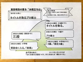 息子は、小学生のうちに奨励会に入るという目標を実現し、当時は奨励会5級でした。発表会では、中学校(入学)までに「奨励会3級」、高校(入学)までに「奨励会三段」、16歳で「プロ棋士」、20歳までに「タイトルを取る」という志を発表しました。