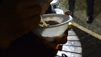 雨が地面を冷たくぬらす4月のある水曜日の夕方。県の玄関口、JR岐阜駅は大勢のサラリーマンや学生、買い物客らでにぎわっていた。それとは対照的に、南口にある公園・清水緑地に一人、また一人と、無精ひげがのぞく中高年の男性ばかりが集まってくる。「アーメン」。6人が祈りをささげ、あずまやで雨をしのぎながらけんちん汁をつつき始めた。