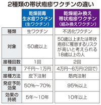 原則50歳以上の人が対象ですが、組み換えワクチンは帯状疱疹に罹患(りかん)するリスクが高いと考えられる18歳以上の人は受けることができます。妊婦や免疫力の低下している人では、生ワクチンは受けることができませんが、組み換えワクチンは受けることができます。