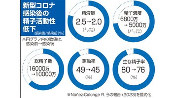 スペインの多施設(不妊治療専門クリニック)での集計結果が注目されています。通院中の男性の新型コロナ感染前と感染100日後を比較すると=図=、精液の量は20%減少し、精子の濃度は26・5%低下していました。精子の総数は37・5%、運動率は9・1%、生存精子率は5%減少していました。しかも、約半数の男性では、総精子数が50%以上の減でした。この100日という数字は、精子が新たに作られ射精されるまで3カ月ほど要するために設定された期間です。精子の形態的な評価についても、形が異常を示す精子が60%以上という高い頻度で確認されたという報告もあります。