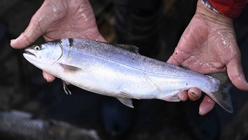 11日朝、白銀に輝く37センチのサツキマスがかかった。「きれいやねぇ。いつ見ても気持ちがええ」。この時ばかりは、松野さんの顔がほころんだ。