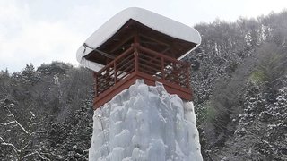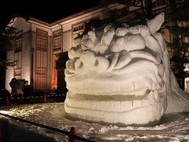 巨大な獅子頭、城下町に現る 郡上八幡旧庁舎記念館前に雪像お目見え