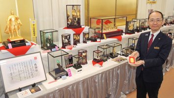 黄金色に輝く純金ずらり 小判やフクロウの置物、岩田時計舗で展示