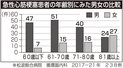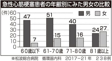 コロナ禍による病床逼迫(ひっぱく)のために、都内で急性心筋梗塞の80代の女性が10カ所以上の病院に断られ、死亡したとの新聞報道を見ました。近年は、80歳以上の高齢者だけでなく平均年齢50歳前後の若年者の心筋梗塞も珍しくありません=グラフ上=。さらに、女性の心筋梗塞患者の病状は、高齢でなくても男性より深刻で重症化しやすく、死亡率も高いことをご存じでしょうか。