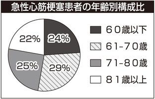 女性は閉経後にはエストロゲンの作用が失われることや総コレステロール値が上昇してくることが多いのですが、動脈硬化の進行にはそれなりの期間が必要なためすぐには心筋梗塞になりません。しかし平均寿命が延びたために、閉経女性では十分な期間、さまざまな危険因子の暴露を受けるため、男性と同等に心筋梗塞が増加していきます。当院の過去5年間の心筋梗塞のデータをみると、男女比は、60歳以下で6・7対1、61~70歳で3・4対1、71~80歳で2・5対1、81歳以上で0・9対1でした=グラフ下=。70歳を過ぎると女性の心筋梗塞が増えてきて80代では男女比が逆転しています。