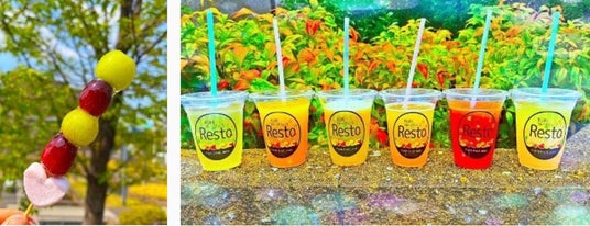 オレンジやグレープフルーツのほか、季節のフルーツを使った生しぼりフルーツジュースやレモンソーダ、フルーツ飴(りんご・いちご・マスカット)を販売します。