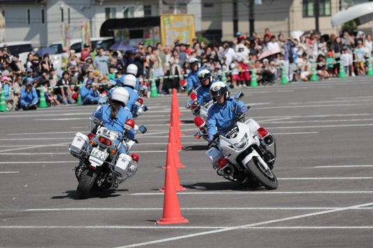 岐阜県警察本部交通機動隊の隊員6名による、白バイドリル走行披露を行います。ドリル走行とは、左右にバイクを傾けながら障害物をかわしたり、きれいな円を描いて旋回したりするアクロバティックな走行のこと。複数の白バイが息を合わせて華麗に駆け抜ける様子は圧巻です。